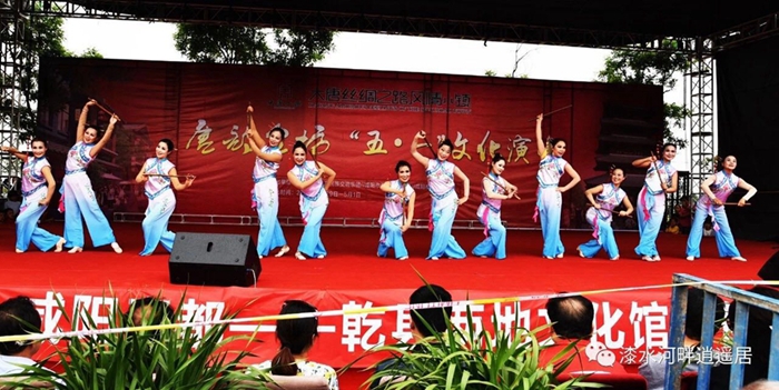上午10点,咸阳市秦都区文化馆一行70多人参观了乾县文化馆各个展室及群众文化活动厅,进行了群众文化活动经验交流学习,后汇合乾县文化馆演职人员共计150余人赴大唐丝路风情小镇进行两馆文化交流演出。本次交流活动参演的节目共有16个,以两馆精选的优秀原创群文节目为主。其中秦都文化馆原创舞蹈《咸阳河水biangbiang面》、《低头族》、少儿群口快板《让中国好梦早筑成》;乾县文化馆编排的小品《麻将风波》 、朗诵《大美乾县,我们的家园》、快板《赞乾县》贴近时代、贴近生活、贴近群众,赢得了现场观众的阵阵掌声。