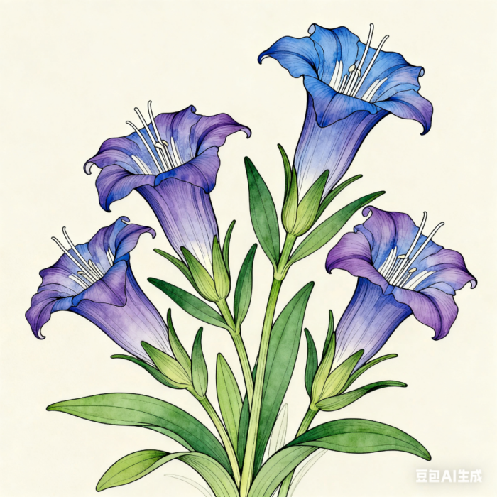 龙胆的花期很长,外表看似弱不禁风,其实生命力很顽强,即使过了霜降时节,依然傲立于寒风之中。《本草纲目》中形容它:“叶如龙葵,味苦如胆”,因此得名。龙胆花簇生在枝顶和叶腋处,形状好像钟唇外张的梵钟,只是倒了过来钟口向上,花瓣淡蓝色或蓝紫色,有时喉部生有黄绿色的斑点。野生龙胆多长在两山之间的高坡上,也许是因为在它生长的地方常有流水,古人又把它叫作“陵游”。若是把“龙胆”和“陵游”两个名字放在一起,犹如龙游于山间,联想起来别有趣味。