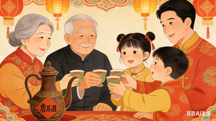 屠苏酒是一种由大黄、白术、桂枝、防风等多种草药酿制的药酒,相传为汉末名医华佗创制。古人认为,元旦饮用屠苏酒能驱散一年的疫气、抵御疾病侵袭,守护全家健康。其饮用顺序尤为特别 ——从年少者到年长者依次饮用,寓意 “年少者得岁,先贺之;年长者失岁,后避之”,饱含对晚辈成长的祝福和对长辈安康的祈愿。