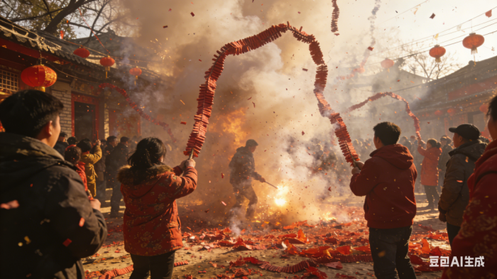 放鞭炮是元旦(古代多指农历正月初一)迎新的标志性习俗,核心寓意是驱邪避凶、辞旧迎新,在陕西地区的传统新年中曾占据重要地位。