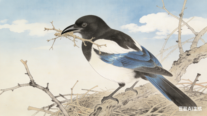喜鹊感知阳气渐生,开始衔枝筑巢,为繁衍后代做准备,其筑巢方向多朝向太岁方位,被视为新春将至的吉祥之兆。