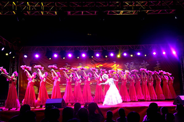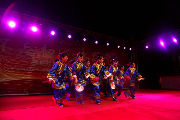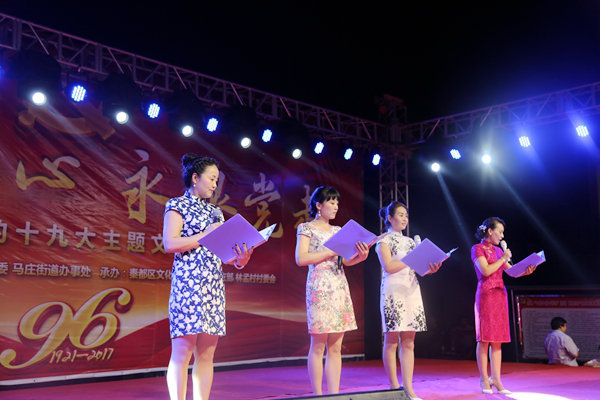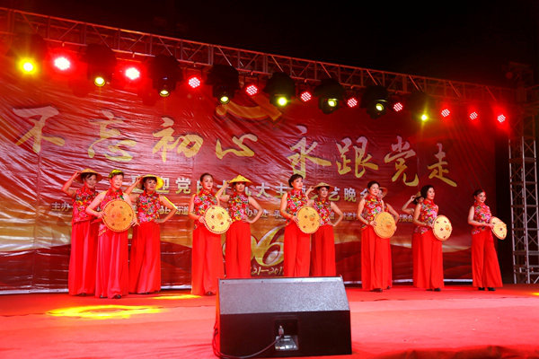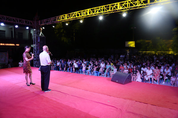 演出当晚,林孟村中心广场早早就被等待观看节目的群众围的水泄不通。尽管已进入盛夏,暑气炎炎,但观看区座无虚席,观众们等待观看演出的热情远胜于这燥热的天气。演出一开始,在《再唱山歌给党听》的音乐声中,舞蹈演员们翩翩登场,整齐的律动,优美的身姿赢得了观众的阵阵掌声。接下来的歌曲演唱《永远跟党走》、四人合诵《旗帜在东方飘扬》秦腔清唱等节目均受到大家的喜爱,掌声、叫好声接连不断。整台晚会以歌颂赞扬中国共产党带领中国人民历尽艰辛创造幸福美好生活为主题,使广大农村党员更加坚定了“不忘初心 永跟党走”的理想信念,促进了农村党支部堡垒作用的发挥,弘扬了主旋律,传播了好声音,凝聚了正能量,为当地群众献上了一道丰盛的文化大餐,表达了对党的无限热爱和对祖国的美好祝福。与此同时,文化馆的志愿者还为现场的观众发放了创文知识宣传扇和收纳袋100余份。