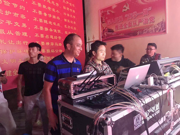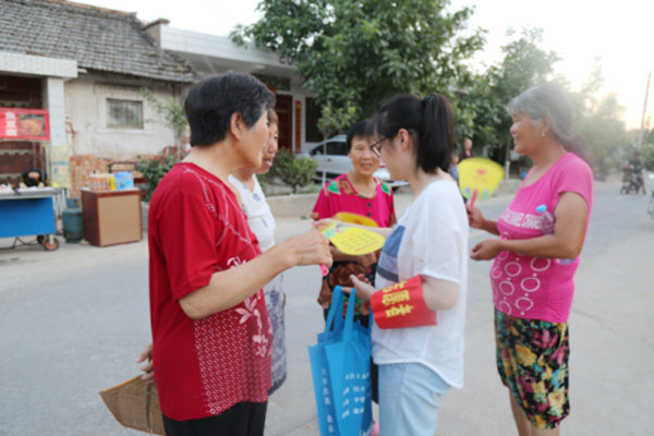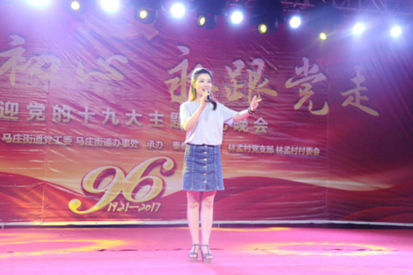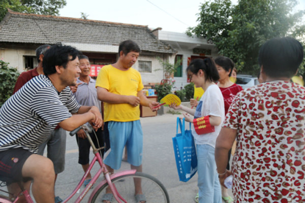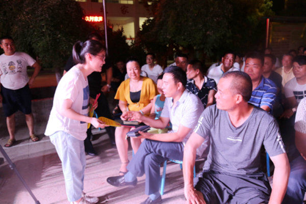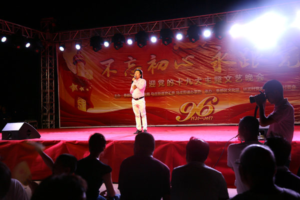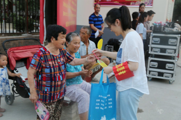 2017年7月18日晚,“不忘初心 永跟党走”喜迎党的十九大主题文艺晚会开始前,秦都区文化馆志愿者在马庄办林孟村进行志愿者服务活动,晚会前准备演出设备并发放创文知识宣传扇和手提袋100余份。