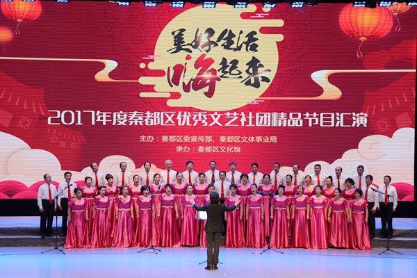 为了积极贯彻落实党的十九大精神,丰富活跃辖区群众文化生活,不断满足人民对美好生活的向往与追求,充分展示秦都区文化工作者在过去的一年里发挥组织辅导作用,培育扶持优秀群众文艺社团所取得的成果以及广大人民群众的良好精神风貌,巩固全国文明城市创建成果,助力开放富裕绿色文明幸福新秦都建设,奋力谱写新时代秦都追赶超越发展新篇章,由秦都区委宣传部、区文体事业局主办,区文化馆承办的“美好生活嗨起来”2017年度秦都区优秀文艺社团精品节目汇演二零一八年元月二十六日下午在咸阳大秦剧院隆重举行。