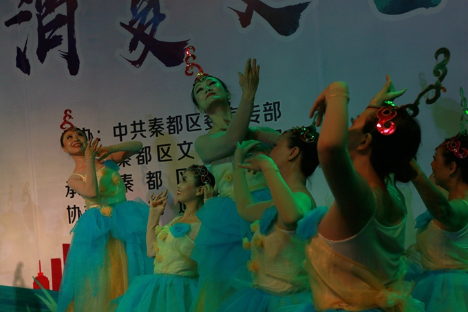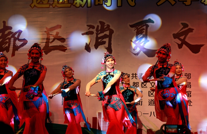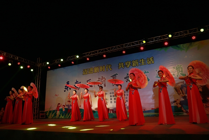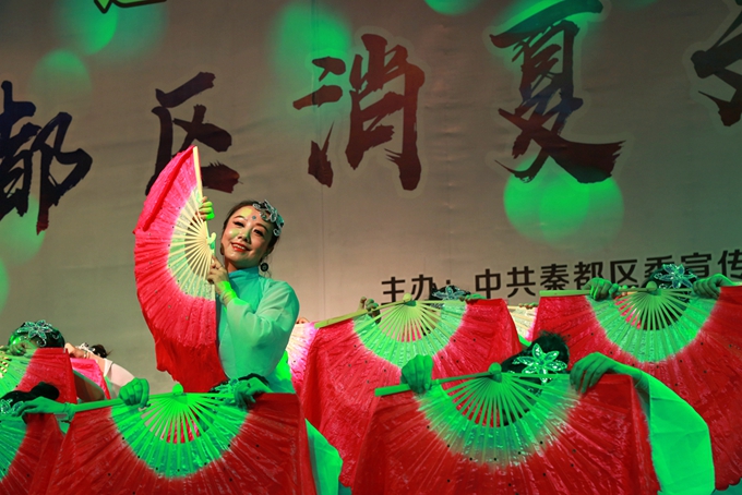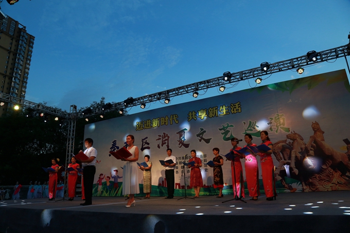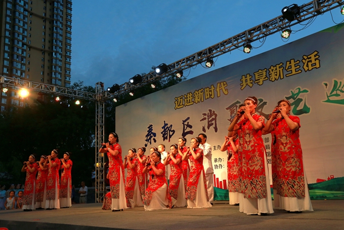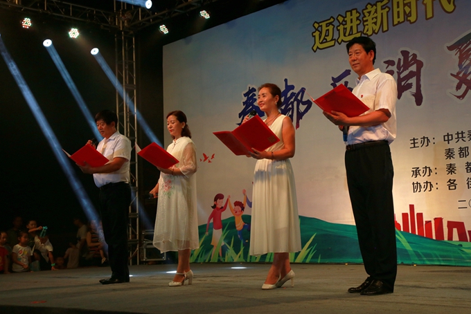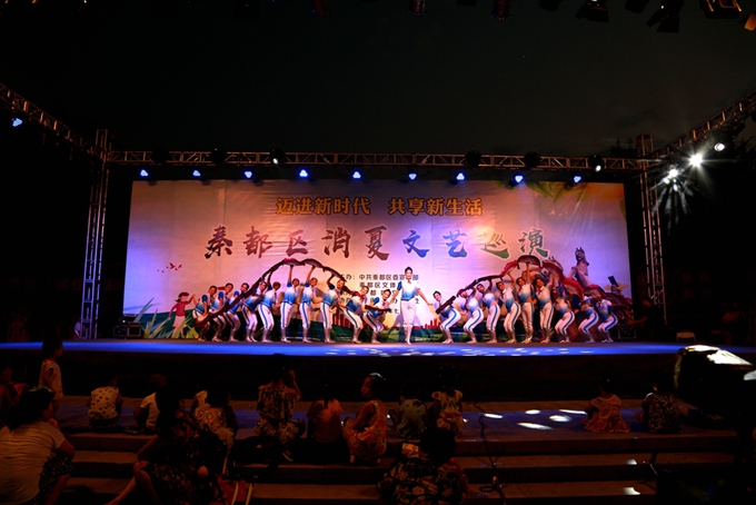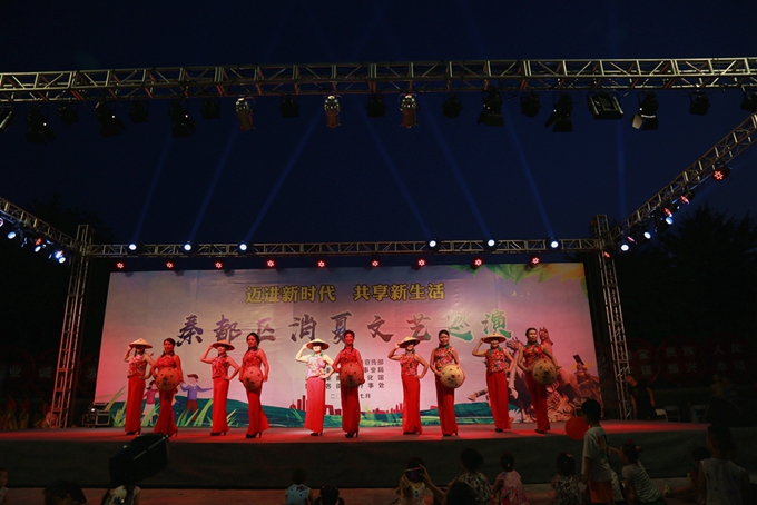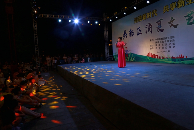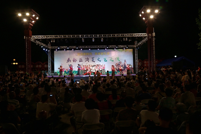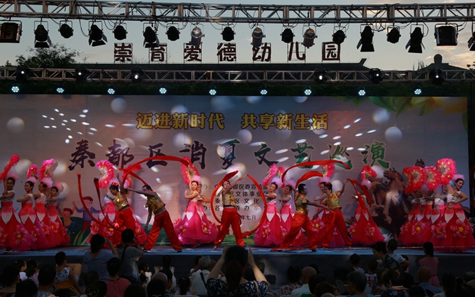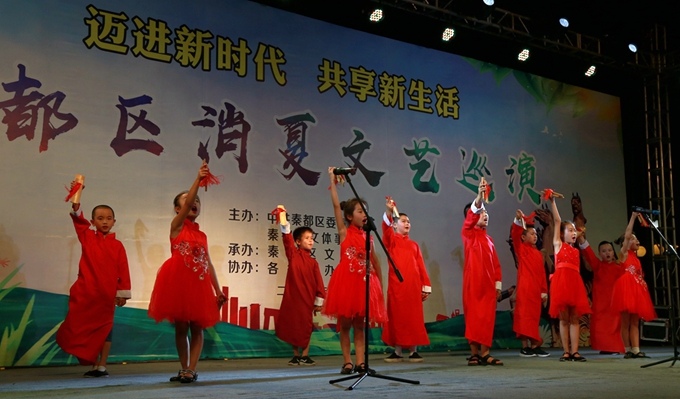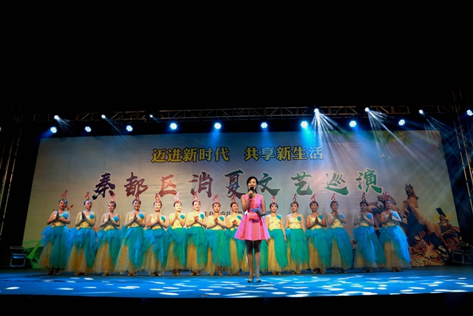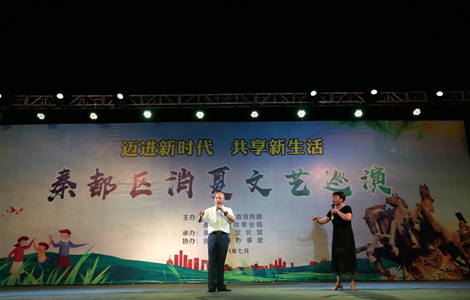 为充分展现新时代秦都人的良好精神风貌,不断满足人民群众对美好生活的向往与追求,展示社区文化建设成果,引导居民共建美丽健康、文明和谐的社区环境,由中共秦都区委宣传部、秦都区文体事业局主办,秦都区文化馆承办,辖区各街道办事处协办的“迈进新时代 · 共享新生活”消夏文艺巡演活动于2018年7月24日至27日在咸阳市中华广场如期举行。此次巡演共有四场演出,以秦腔专场和综艺演出为主,中间穿插有咸阳市扶贫小戏巡演活动,内容丰富、形式多样、参演人数众多、具有较强的艺术感染力,为弘扬传统文化,践行社会主义核心价值观起到了很好的引领和示范作用。