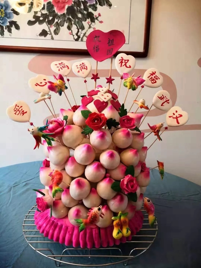 秦都区民间艺人岳若惠创作花馍作品《桃山》 桃子表示祝福,由众多桃子组成桃山,以示万众一心,满满的桃子,寄去暖暖的爱,蝶飞燕舞花儿开,美好春天就要到来,祝福祖国,祝福武汉,抗击疫情,共度难关,早日战胜疫情,还人们健康平安!