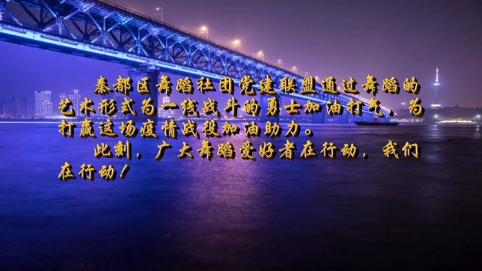 秦都区舞蹈社团党建联盟、秦都区文化馆通过网上微课,组织联盟社团学习、录制舞蹈视频《加油武汉》,通过这种形式向防控一线的工作者致敬,为打赢这场疫情战助力。