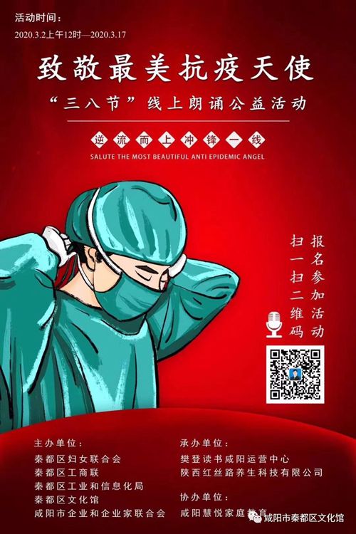 由秦都区妇女联合会、秦都区工商联、秦都区文化馆、秦都区工业和信息化局、咸阳市企业和企业家联合会、樊登读书咸阳运营中心六家单位联合发起的“致敬最美抗疫天使” 2020“三八”节线上朗诵公益活动在广大朗诵艺术爱好者的积极参与支持下,通过主办、承办、协办单位的精心组织,前后历经20天,参与选手200余人,受到社会关注点赞万余人,经过选手们的激烈角逐,评委会的严格评选,在大家的期待下,各类奖项均已揭晓。今天,给大家推送一等奖作品《我亲爱的孩子们》《致敬白衣天使》,请欣赏。
