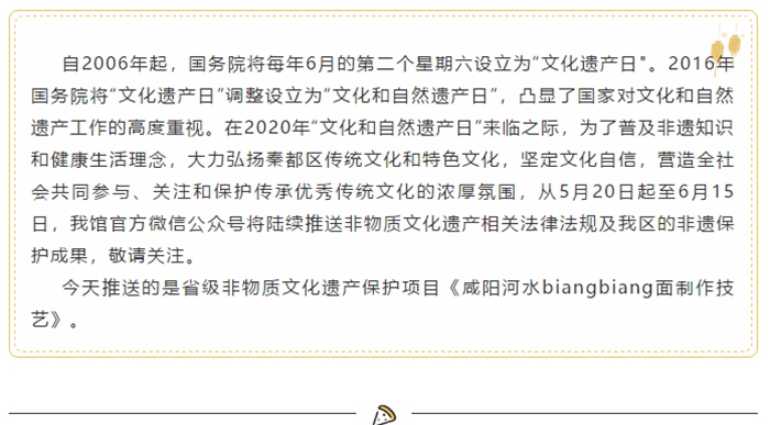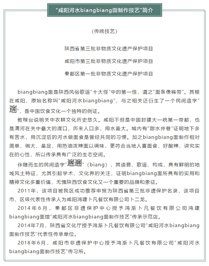 为了宣传、传承这一项目,我馆经过精心创作,编排了舞蹈《咸阳河水biangbiang面》,先后参加了陕西省第二届社区艺术节、陕西省第三届农民艺术节、第三届陕西省“群星奖”等活动,分别荣获原创作品奖、优秀剧(节目)奖、优秀表演奖等荣誉,在省市区的各类文艺演出中,以独特的舞台魅力深受老百姓的喜爱。