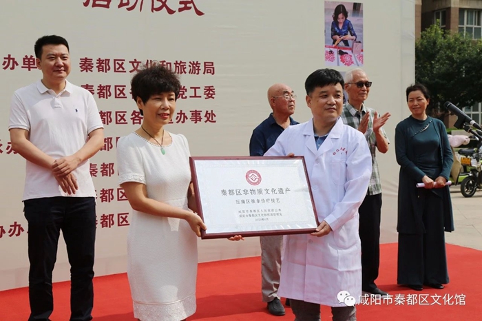 启动仪式由区文化和旅游局副局长倪健主持,秦都区文化馆馆长、区非遗保护中心主任赵艳妮对我区近年来在非遗保护硬件建设、申报工作、传承基地建设和特色宣传展示等方面情况做了整体介绍;区文化和旅游局副局长梁洁宣读了秦都区人民政府关于公布第六批区级非物质文化遗产代表性项目名录、代表性传承人、传承单位的通知;为压痛区推拿诊疗技艺保护单位咸阳杨仨(sa)疼痛医院、两寺渡红拳保护单位两寺渡武术协会、压痛区推拿诊疗技艺项目代表性传承人杨云刚、咸阳面花制作技艺项目代表性传承人岳若惠颁发了传承单位牌匾及传承人荣誉证书。