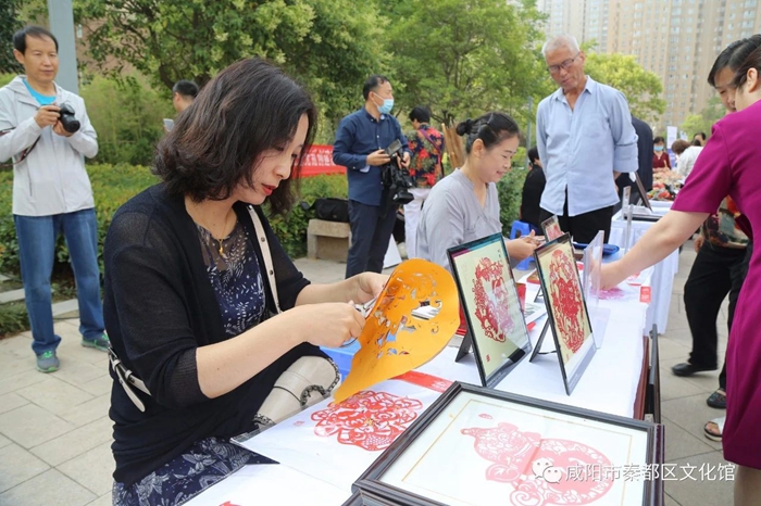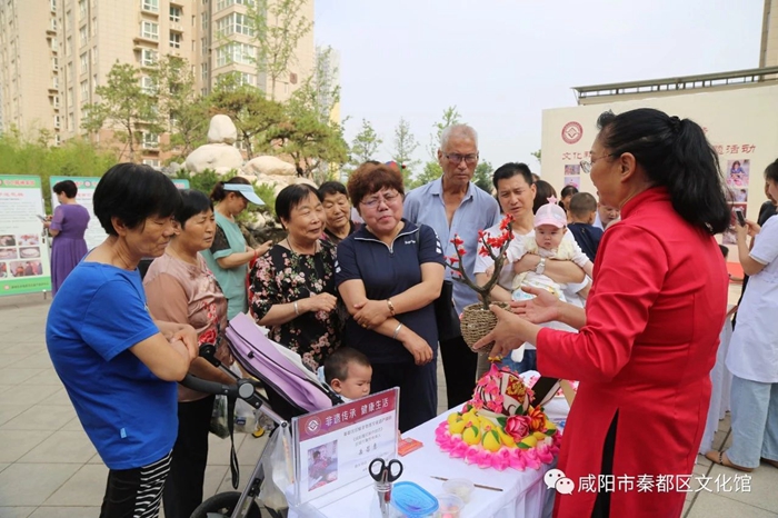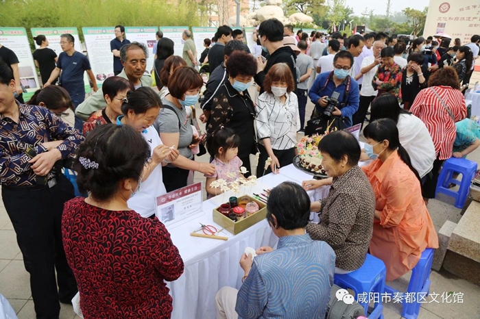 启动仪式现场,非遗保护成果静态展览与传承人现场活态展示同时进行,我区省级非遗项目《咸阳河水Biangbiang面制作技艺》《重阳追节送花糕》《气血和胶囊制作技艺》、市级项目《秦都咸阳民间剪纸》《炭精画》、区级项目《西部戏剧脸谱绘画》《咸阳面花制作技艺》《压痛区推拿诊疗技艺》《布贴画》等项目传承人为广大社区居民讲述各自绝活技艺,吸引了许多的围观者。本次活动将从6月11日至6月25日,在辖区各社区巡回宣传展示,7月至10月还会在辖区校园、广场、景区开展。