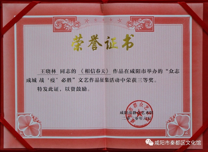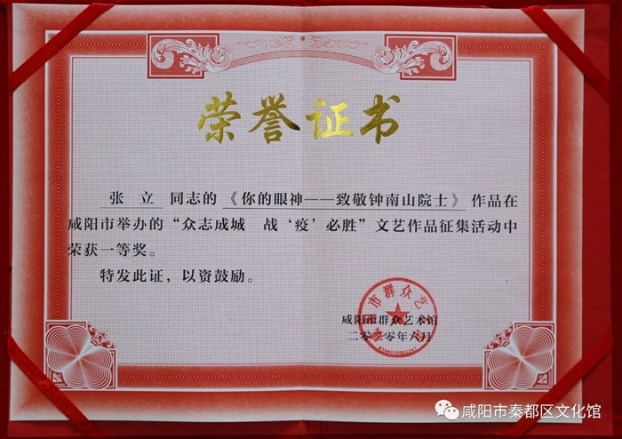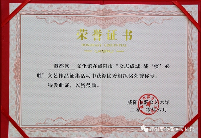 2020年6月11日上午,2020年全市文化馆长工作会议在咸阳市市民文化中心举行。会上,市群众艺术馆馆长李军对2019年及2020年上半年工作予以总结,对2020年下半年重点工作进行了安排部署,对各县区文化馆先进集体进行了表彰,对参与“众志成城 战‘疫’必胜”文艺作品征集活动先进集体及个人进行了表彰。我馆荣获2019年咸阳市群文工作优秀单位、咸阳市“众志成城 战‘疫’必胜”文艺作品征集活动优秀组织奖;我馆声乐干部张立演唱的歌曲《你的眼神——致敬钟南山院士》、文学干部王晓林原创诗歌《相信春天》在咸阳市举办的“众志成城 战‘疫’必胜”文艺作品征集活动中分别荣获一等奖和三等奖。