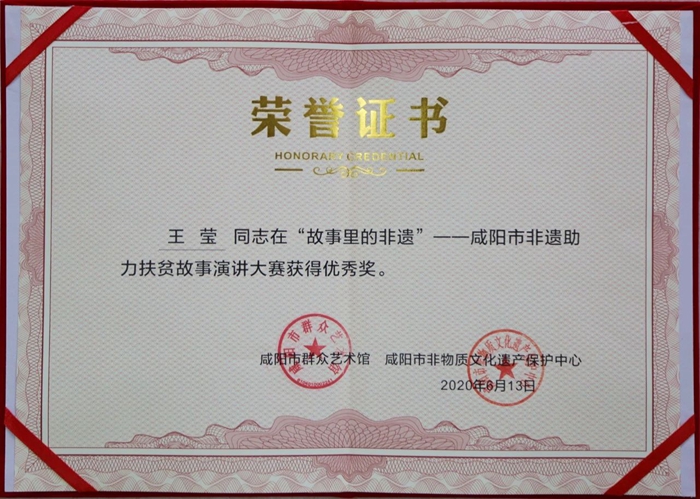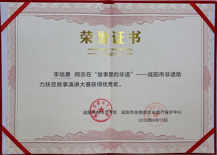我馆推荐非遗保护项目《气血和胶囊制作技艺》保护单位陕西摩美得制药有限公司的两名选手,参加咸阳市群众艺术馆、咸阳市非物质文化遗产保护中心举办的“故事里的非遗”——咸阳市非遗助力扶贫故事演讲大赛荣获优秀奖。