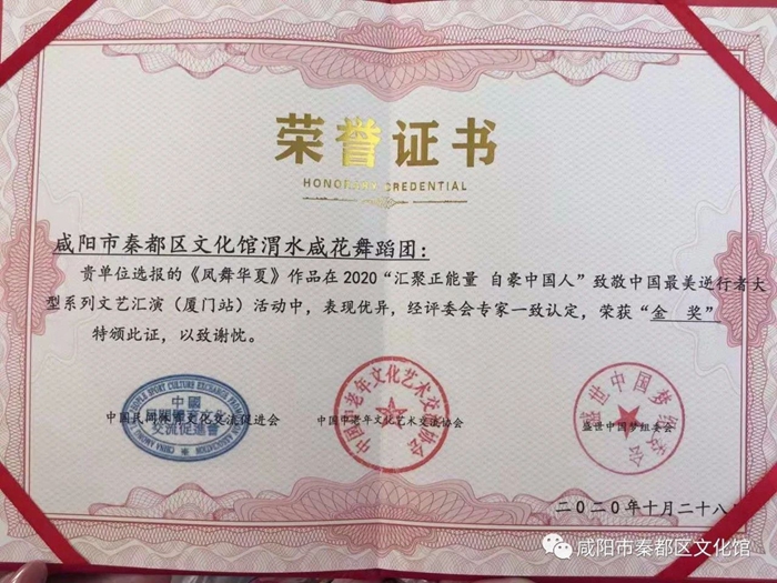 10月28日,我馆渭水咸花舞蹈队在厦门举办的2020“汇聚正能量 自豪中国人”致敬中国最美逆行者大型系列文艺汇演(厦门站)活动中,荣获金奖。