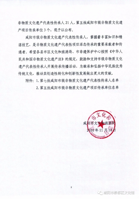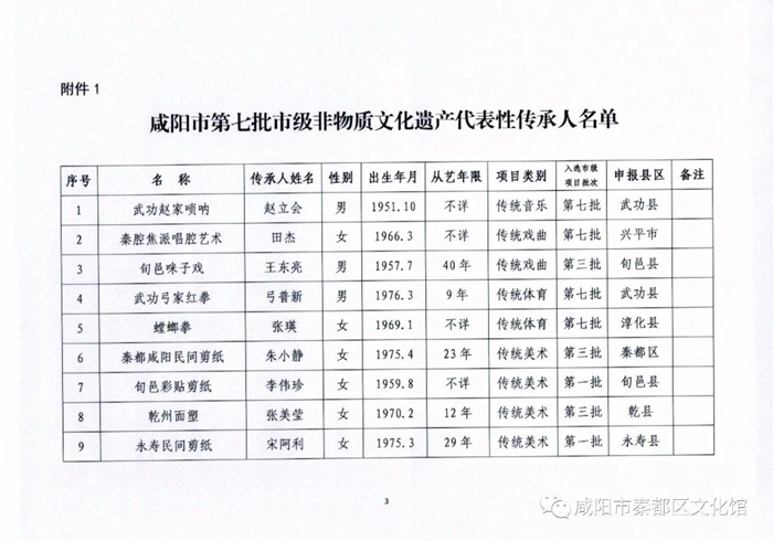 近日,由我馆推荐申报的非遗传承人《秦都咸阳民间剪纸》朱小静、《咸阳面花》岳若惠、《压痛区推拿诊疗技艺》杨云刚被认定为第七批咸阳市级非物质文化遗产代表性传承人,《两寺渡武术协会》《咸阳杨仨疼痛医院》被认定为第五批咸阳市市级非物质文化遗产项目传承单位。