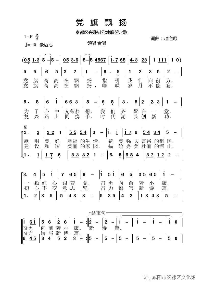12月31日,由秦都区文化和旅游局、秦都区文化馆制作的音乐MV《党旗飘扬》在学习强国平台发布。该作品由秦都区文化馆赵艳妮作词、作曲,并和我馆音乐干部张立共同演唱。歌曲旋律激昂,唱词质朴,赞颂了在党的旗帜引领下,人民安居乐业,祖国繁荣昌盛的美好景象。