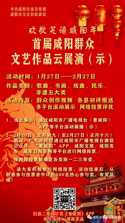 3、网络投票。作品报送结束后,于2月20日(正月初九)至2月27日(正月十六)期间,广大市民可通过咸阳发布、咸阳日报亲网、咸阳文旅、咸阳市广播电视台微信公众号、“看咸阳”app进行网络投票。